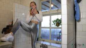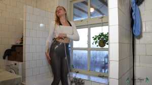 Eileen taking a shower in her bathroom fully-clothed in her silver leggings and taking off her clothes.